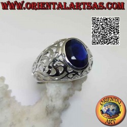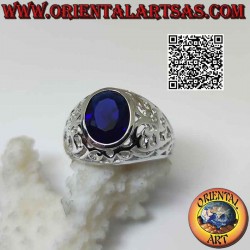 La piedra engastada es un zafiro sintético, es decir, una gema reproducida, o mejor dicho, "clonada" en laboratorio mediante el uso de temperaturas y presiones muy altas y procesos sofisticados. Tiene las mismas características físicas y químicas que los zafiros naturales.