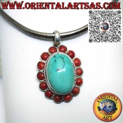Colgante artesanal de plata 925 con turquesa tibetana natural ovalada y 14 corales rojos. Una joya única con esencia étnica.