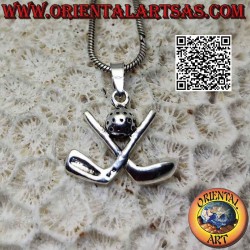 Deportivo y refinado colgante de plata 925 que representa dos palos de golf cruzados con una pelota central. El regalo perfecto para cualquier apasionado del golf.