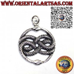 Colgante artesanal en plata de ley 925 con el diseño del Auryn, antiguo talismán formado por dos serpientes entrelazadas en un círculo. Este símbolo místico representa el equilibrio entre opuestos, la unidad y el poder de la transformación.