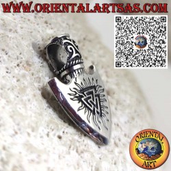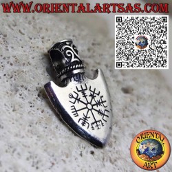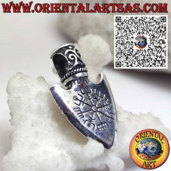Colgante artesanal en plata 925 con forma de punta de flecha vikinga, símbolo de protección, fuerza y valentía. Grabado con dos poderosos símbolos nórdicos: