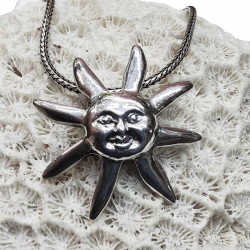 Luminoso colgante de Plata 925 con un acabado liso y pulido. El diseño presenta el clásico Sol con un rostro sereno, rodeado de rayos. Un poderoso talismán de optimismo, vitalidad y luz interior.