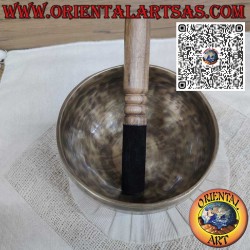 El cuenco tibetano, con un impresionante diámetro de 15 cm y un peso de 675 g, es un ejemplo excepcional de artesanía tradicional. Hecho a mano con una fina aleación de siete metales – oro, plata, mercurio, cobre, hierro, estaño y plomo – este cuenco está afinado en la nota "Re" con una frecuencia de 329 Hz. Este tono profundo y vibrante estimula el segundo chakra, el chakra sacro, favoreciendo el equilibrio emocional y la creatividad. El sonido que produce es rico y envolvente, con una resonancia poderosa que llena los espacios amplios, lo que lo hace ideal para meditaciones grupales, ceremonias espirituales y prácticas avanzadas de relajación. El mazo de madera, normalmente cubierto de fieltro, permite obtener un sonido suave y completo, tanto al golpear como al frotar el borde del cuenco. Este cuenco ofrece una experiencia sonora profunda y auténtica, ideal para enriquecer las prácticas de meditación, yoga y terapias de sonido, creando una atmósfera de paz y armonía que eleva la experiencia espiritual.
