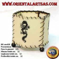 Portavelas de piel de oveja en forma de prisma hexagonal con un dragón dibujado en los laterales
