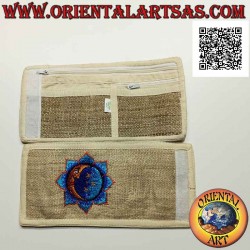 Cartera de cáñamo de cuatro bolsillos con dos cremalleras con bordado "Sol y luna", hecha a mano en Nepal utilizando 100% fibra natural orgánica de cáñamo