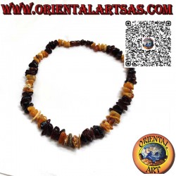 Este collar es una elegante fusión de ámbar natural claro y oscuro del Báltico. La longitud del collar lo convierte en un complemento versátil, apto para lucir en diversas ocasiones. Las grandes piezas de ámbar, con sus tonalidades que van del dorado claro al marrón oscuro, añaden un toque de calidez y sofisticación a cualquier conjunto. Cada pieza de ámbar tiene una historia única, moldeada por el tiempo y la naturaleza, y su disposición en el collar crea un interesante equilibrio visual. Con cierre de rosca color ámbar.