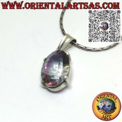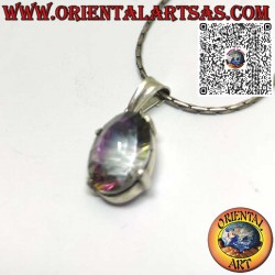 Este elegante colgante está hecho de plata 925, elaborado por expertos para maximizar la piedra estrella: un cuarzo aura ovalado, brillante e iridiscente. La gema, con matices iridiscentes que reflejan los tonos del arco iris, está engastada con cuatro puntas finas pero resistentes, que realzan su belleza sin cubrir su superficie.