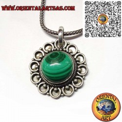 Colgante de plata 925 con malaquita natural redonda, acabado a mano con círculos decorativos. Una joya artesanal única y llena de energía.