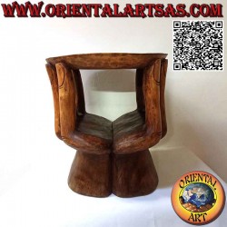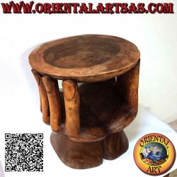 Escultura de dos manos que sostienen la tapa para crear una mesa redonda para la sala de estar, hecha de un solo bloque de madera de suar excavado y tallado a mano en Indonesia. Única pieza