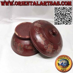 Récipient ancien à couvercle rond en bois d'acajou coloré de motifs floraux, fait à la main par le peuple Dayak de Bornéo malaisien, pièce unique achetée en 1985 dans l'ouest de Bornio malaisien auprès d'un collectionneur d'art local.