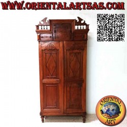 Armoire garde-manger antique avec 2 portes et 4 étagères avec colonnes décoratives en bois de teck massif fabriqué en Indonésie à la fin des années 1920 Le meuble sera livré fini dans les moindres détails même s'il s'agit d'un produit ancien et artisanal, il peut avoir des parties usées car il s'agit d'un meuble ancien d'origine.