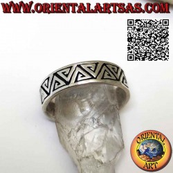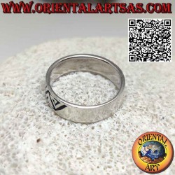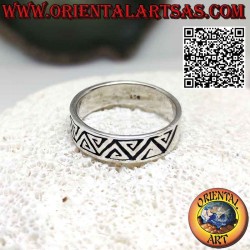 Bague bande avec gravure de spirales triangulaires opposées en argent hypoallergénique 925‰ à la main en Thaïlande. La surface est partiellement brunie pour mettre en valeur la décoration, et elle n'est ni traitée ni plaquée afin de garantir sa beauté au fil des ans.