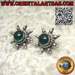 Belles boucles d'oreilles en forme de soleil avec des rayons avec une agate verte centrale, faites à la main par des artisans balinais qualifiés en argent hypoallergénique 925. La surface est partiellement brunie et n'est pas plaquée, garantissant ainsi sa beauté et son charme au fil des ans.
