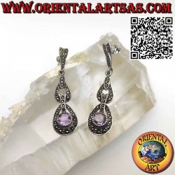 Boucles d'oreilles longues en argent massif 925‰ hypoallergénique avec améthyste ronde naturelle et marcassites, la surface est partiellement brunie, pour garantir sa beauté au fil des années. il n'est pas plaqué