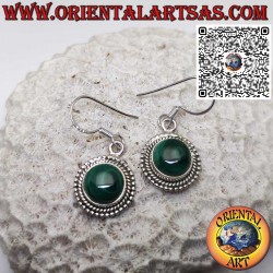 Boucles d'oreilles en argent avec Malachite ronde entourée de galon et de sphères, en argent 925‰ hypoallergénique. La surface est partiellement brunie pour mettre en valeur le travail et garantir sa beauté au fil des années. (la boucle d'oreille n'est ni traitée ni plaquée mais en argent massif) sans nickel