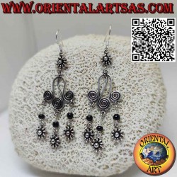 Belles boucles d'oreilles avec une petite fleur au sommet et trois spirales jointes et 3 sphères d'onyx avec des fleurs pendantes en argent 925 ‰ hypoallergénique sans nickel