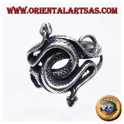 Imposante bague avec deux cobras entrelacés réalisée en Argent 925. Un bijou homme au fort symbolisme, représentant le pouvoir, la protection et l'équilibre. Parfait comme cadeau original pour ceux qui aiment un style audacieux et magnétique.