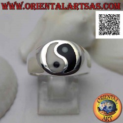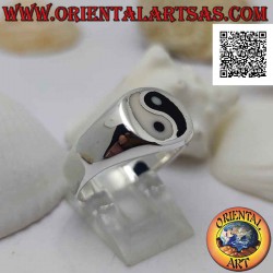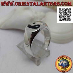 Bague en argent lisse avec yin yang de nacre et onyx dans le cercle (épais)