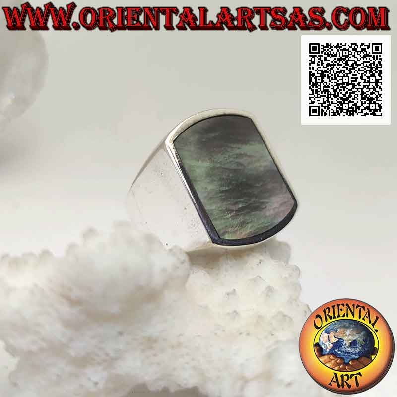 Bague en argent avec coquille de paua rectangulaire (ormeau) bombée sur deux côtés affleurant le bord sur un sertissage lisse