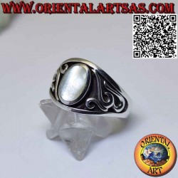 Bague en argent avec nacre ovale et décorations sculptées en haut-relief