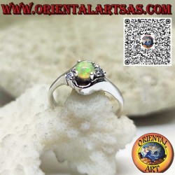 Bague oblique "trilogie" en argent avec opale arlequin ronde et zircon blanc sur le côté