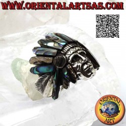 Bague en argent, tête de sauge amérindienne avec coiffe d'ormeau (paua) et plumes sur les côtés (B)