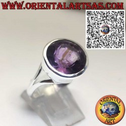 Élégante bague en argent avec une améthyste naturelle ronde, sertie dans un bord lisse haut qui met en valeur son éclat et sa couleur violette profonde.