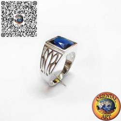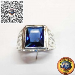 Bague homme en argent 925 avec saphir synthétique rectangulaire et gravures artisanales. Élégante et raffinée.
