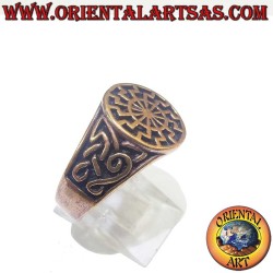 Imposante bague en bronze au design symbolique puissant. Le dessus représente le Soleil Noir à douze rayons, symbole de transformation et de lumière intérieure, tandis que les côtés sont décorés de nœuds celtiques en haut-relief représentant l'éternité et le cycle de la vie. Diamètre du symbole 14 mm, poids 8 grammes. Une bague robuste et recherchée pour les amateurs de symboles anciens.