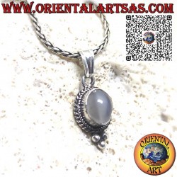Élégant pendentif en argent 925, orné d’une pierre de lune naturelle ovale, à la lueur laiteuse et aux reflets chatoyants. La gemme est sertie dans un cadre tressé qui met en valeur son éclat tout en évoquant un artisanat raffiné et intemporel. Trois petites sphères en argent disposées sous la pierre complètent le design avec harmonie et délicatesse.