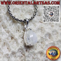 Pendentif raffiné en argent 925, orné d’une pierre de lune arc-en-ciel naturelle taillée en goutte, au charme éthéré et aux reflets irisés. La pierre est sertie par trois griffes fines mais solides, qui mettent en valeur sa forme et laissent passer la lumière pour révéler l’iridescence naturelle de la gemme.