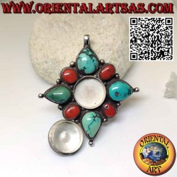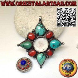 Spectaculaire ancien Gao Kalachakra énorme avec quatre turquoises goutte plus quatre coraux ovales et un lapis central entouré d'autres coraux ronds