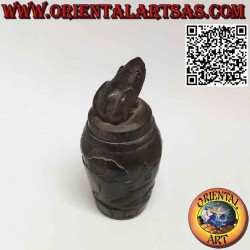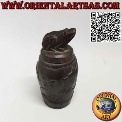 Boîte ronde pour la médecine incrustée à la main en bois de fer de Bornéo Eusideroxylon Zwageri fouillé sculpté et décoré par les Dayaks de Bornéo avec grenouille sur le capuchon et animaux et fleurs dans la boîte. Provenant d'une collection privée du Sarawak, acquis en 1983.