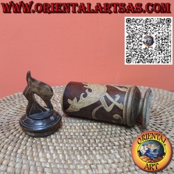 Tube en bambou gravé d'une représentation d'un animal mythologique avec une base et un capuchon en bois, et une statue de dauphin sur le capuchon