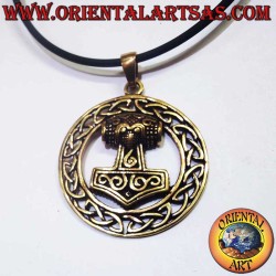 Puissant pendentif en bronze représentant le Marteau de Thor (Mjöllnir) entouré d'un nœud celtique, symbole de protection, force et sagesse ancestrale. Diamètre 32 mm, poids 7,5 grammes. Un talisman viking à la profonde signification spirituelle.