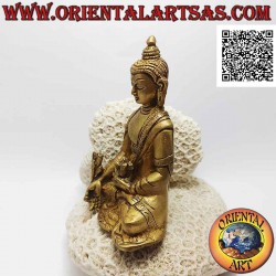 Le Bouddha de médecine dans une ancienne version tibétaine. La main droite est placée en bas dans le "geste d'accueil" (varadamudrā) et tient une branche avec le fruit du myrobalan (Terminalia bellirica, sans. Harītakī) dont le jus est un laxatif. Dans sa main gauche, il tient un mortier pour préparer des médicaments. Il est également appelé Bhaisajyaguruvaidūryaprabha, "Lapis Lazuli Light Medicine Buddha" en raison de sa couleur de peau bleu foncé.