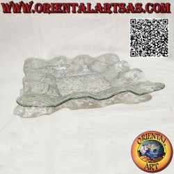 Square centerpiece tray with an elegant and oriental design with lacy edges and silver oriental decorations.