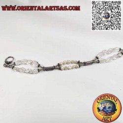 Experience the timeless elegance of this handmade silver bracelet with freshwater pearls and rock crystal, crafted for those who appreciate refined European jewellery. The double row of crystals and the central pearl element create a luminous, sophisticated accessory, enhanced by detailed silverwork. Perfect as an elegant everyday piece or as a special gift for women who love artisanal jewellery. Add brightness and style to any outfit with this precious, timeless bracelet.
