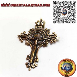 Discover this magnificent bronze crucifix pendant, a true jewel of sacred art crafted entirely by hand. Its rich decoration is inspired by the pomp and complexity of the Baroque style, making it a piece of great visual and spiritual impact.