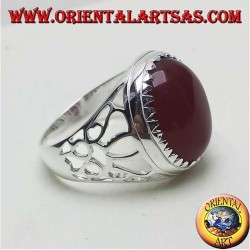 Impressive men's 925 Sterling Silver ring with a stunning natural oval carnelian of 14x16 mm, set with small triangles that enhance its beauty. The polished finish and intaglio workmanship make this piece unique. Symbol of courage, strength and vitality. Weight 7.7 grams.