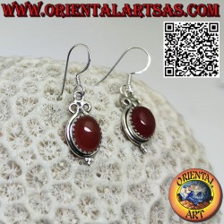 Silver earrings with oval carnelian set and 3 circles above and 3 dots below, made of hypoallergenic nickel-free 925‰ silver. The surface is partly burnished which guarantees its beauty does not fade over the years