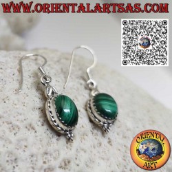 Dangling silver earrings with natural oval malachite set, made of hypoallergenic 925 ‰ silver. The surface is partially burnished to highlight the workmanship and guarantee its beauty over the years. (the earring is not treated or plated but in solid silver) nickel free