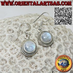Earrings with round natural rainbow moonstone surrounded by spheres and braid, made of hypoallergenic nickel-free 925‰ silver, the surface is partly burnished which guarantees its beauty over the years (it is not plated) and remains unchanged over time