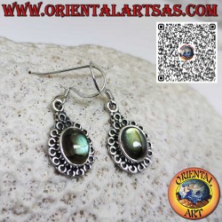 The silver earrings with natural oval labradorite surrounded by circles are refined and sophisticated creations. 925 silver is a high-quality material, known for its durability and shine. Natural oval labradorite adds a touch of unique beauty, with its iridescent shades ranging from blue to green to gray, depending on the angle of the light. These earrings are perfect for those looking for an accessory that combines elegance and naturalness.
