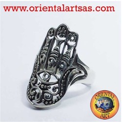Discover the ancient power of the Hamsa Hand with this refined ring, entirely crafted in 925 Sterling Silver. The openwork technique not only enhances the aesthetics of the piece but amplifies its symbolic meaning, allowing energies to flow freely while the solid silver structure acts as a protective shield.