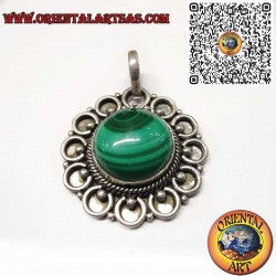 Handcrafted in 925 sterling silver, this pendant features a natural round malachite (Ø 12 mm) framed by delicate hand-carved circles. The deep green stone, symbol of protection and positive energy, gives the piece a unique spiritual charm. Ideal for those who appreciate artisan pendants and genuine gemstones.