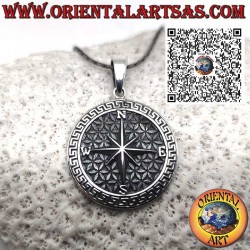 A pendant rich in symbolism, crafted from 925 sterling silver. At the centre lies the Compass Rose, representing guidance, direction, and protection, engraved upon the Flower of Life—an ancient sacred geometry symbol of universal harmony, interconnection, and vital energy.