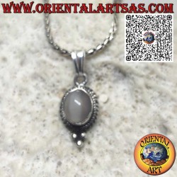 Elegant pendant crafted in 925 sterling silver, featuring an oval natural moonstone with a milky glow and shimmering reflections. The gemstone is set in a braided frame that enhances its beauty and evokes timeless craftsmanship. Three small silver spheres beneath the stone complete the design with harmony and grace.