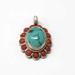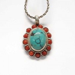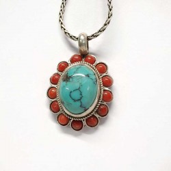925 silver pendant with oval natural Tibetan turquoise surrounded by 13 enchanting corals! single piece,