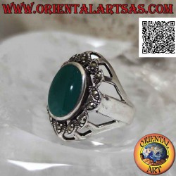 Silver ring with oval green agate surrounded by oval inserts with marcasite and lateral opening